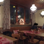 Es hat alles einen neuen Bezug bekommen in so lachs Farben. Die alten Tischplatten wurden durch neue ausgetauscht. Es liegen ein paar Kissen aus. Auf dem Tisch gibt es Mitteldecken oder Läufer in rot-weiß mit Muster im Landhaus Stil. Gegenüber der Schenke ist an der Wand ein Bild und Text mit Geschichte. Davor befindet sich der Stammtisch. Ein paar Krüge und Bilder mit alten Fotos zieren den Raum, alles passend zur Gaststube. Es steht ein Holzbrett am Tisch, darauf gibt es eine Pfeffermühle, einen Salzstreuer, Zahnstocher und das in rote Servietten gerollte Besteck.