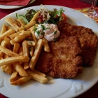 Zwei schön gebräunte Schnitzel liegen auf dem Teller meiner Liebsten, umrahmt von gut gebräunten Pommes frites, einer Salatgarnitur und einem Klecks Chili-Knoblauch-Dip. „Gut gewürzt“, sagt meine Frau, als sie die Schnitzel probiert. Die Schnitzel sind im Fleisch saftig und zart, die Pommes frites sind sehr gut zubereitet, sehr schön knusprig. In der Salatgarnitur aus Gurken, Tomaten und Blattsalat findet meine Frau auch Johannisbeeren, die dem Salat einen fruchtigen Geschmack geben. Allerdings vermißt meine Frau den „Dracula“ im Knoblauch-Chili-Dip, einer Art gewürzter Mayonnaise. Der Dip hätte mehr „Feuer“ vertragen können.