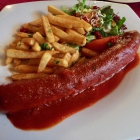 Beim Anschnitt der Currywurst merke ich, daß ich eine regionale Variante auf dem Teller habe. Die Wurst ist keine klassische Bratwurst, sondern eine Siedewurst, so wie man sie im Berliner Raum oft als Currywurst erhält. Die Siedewurst ist für mich nicht der Knaller, lieber habe ich die klassische Bratwurst als Currywurst. Aber wir sind nun mal auf Usedom, und hier wird sie halt so serviert.