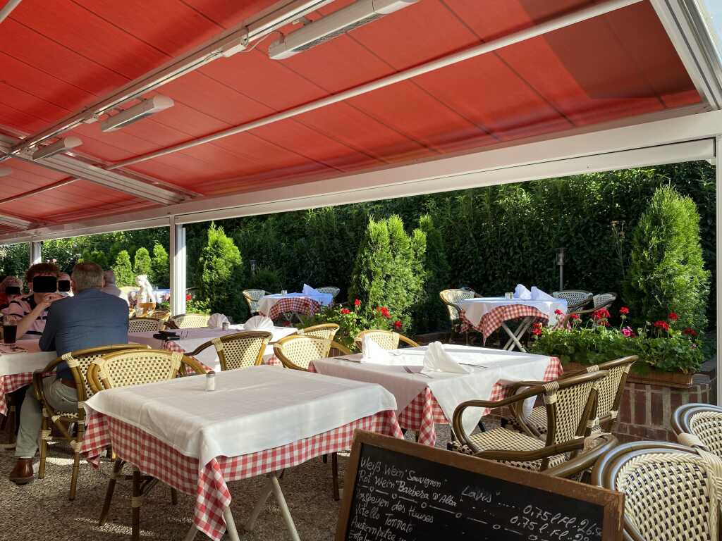 Im hinteren Bereich gibt es Art Bistrotische und Bistrostühle mit geflecht Sitzfläche in grau. Hier stehen die Blümelchen auf dem Tisch. Hier wird mit Schirmen beschattet.