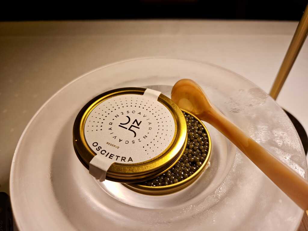 Ganz im Gegensatz zum sündigen (und wohl daher vom bestimmten Artikel entkleideten) N25 Kaviar Oscietra, von dem eine großzügige Nocke nach der Art japanischer Gunkan-sushi in einem Schiffchen aus feiner, vermutlich gedämpfter Zanderfarce serviert wurde.