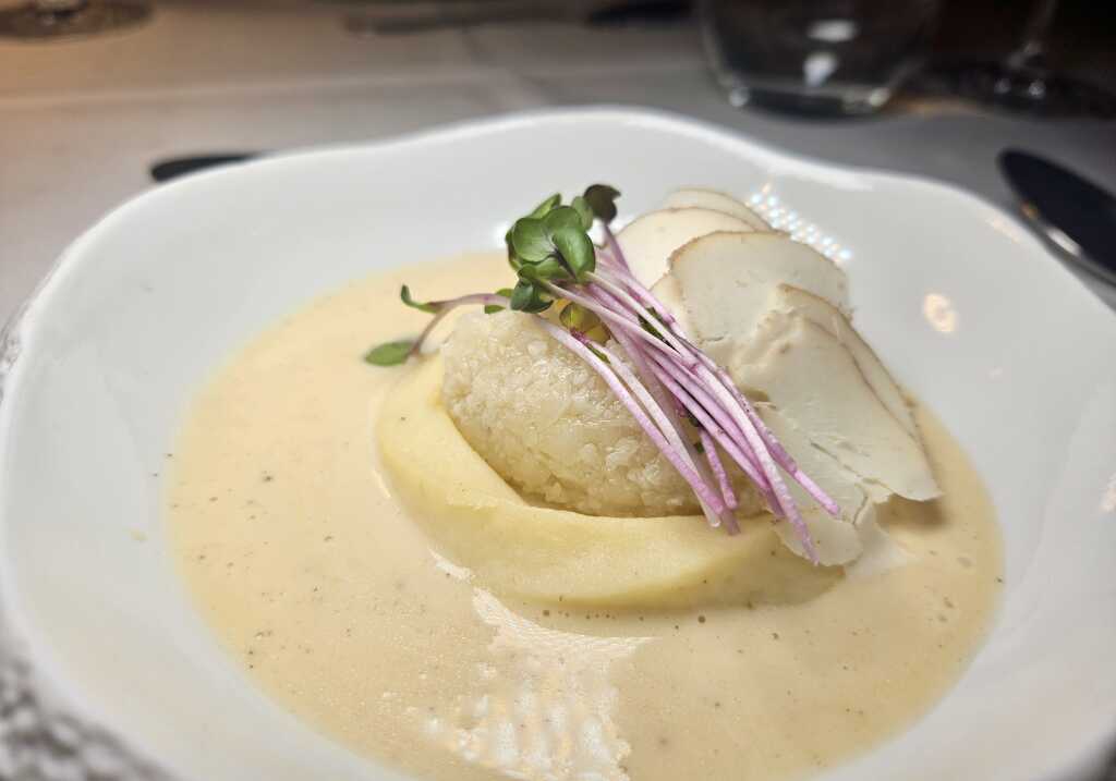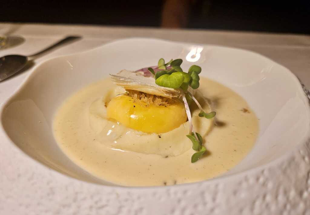 Eigentlich war ich recht sicher, dass die Chef‘s Choice mit dem inzwischen schon ikonischen Kartoffel-Pecorino-Krapfen an Lauch-Rahm weitergehen würde, der immer mit erfreulich viel geraspeltem Trüffel daher kommt.