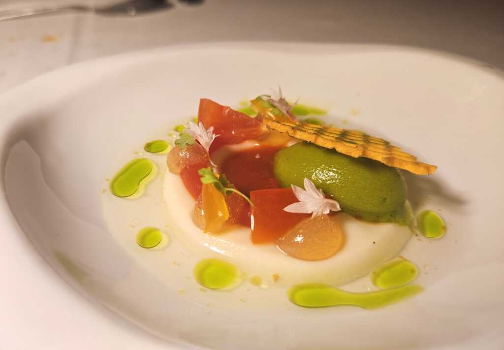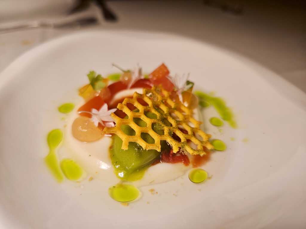 Das Sommermenü startete mit dem Dreiklang aus Tomate, Buttermilch in unterschiedlichen Texturen und Temperaturen sowie Petersilie. Das Kräuter-Eis führte, vermischte sich dann schön mit dem Flan und gab eine Bühne für die verschiedenen sommerlich reifen Tomaten, von denen mir die zu einem weingummi-festen Gelee fermentierte Variante besonders positiv in Erinnerung blieb. Zum Knuspern ein gebackenes Netz, dessen Teig wohl auch Buttermilch enthielt.