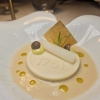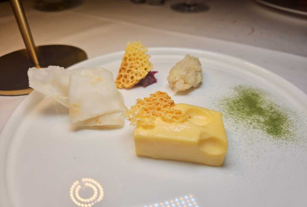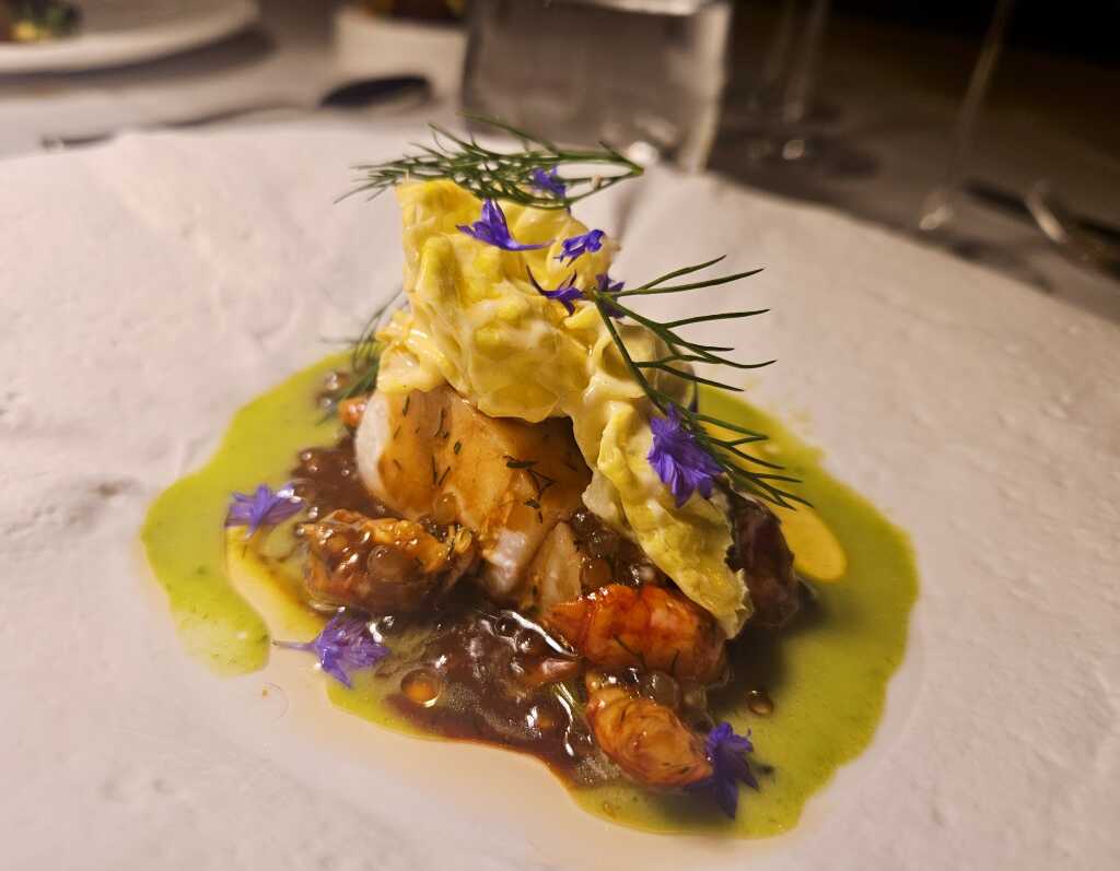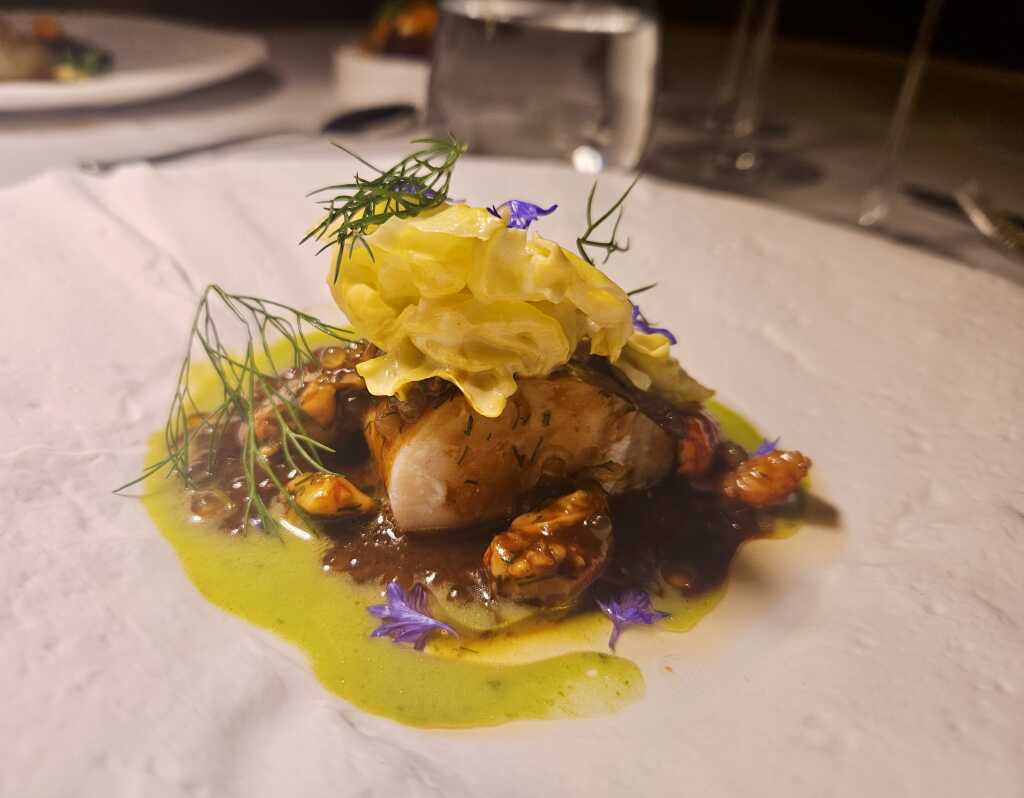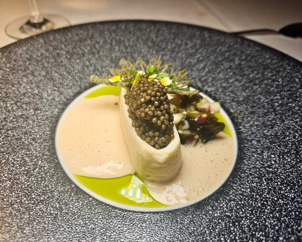 Der wunderschön gestaltete Spiegel aus Buttermilch-Sud und Lauchöl ergänzte mit subtilen Aromen, die den Hauptdarsteller glänzen ließen. Mit Algen-Apfel-Salat kam ebenfalls zurückhaltende Frische dazu. Der Algen-Chip in filigraner Blütenform verzauberte das Auge. Vielleicht eine Hommage an den Klassiker Steinbutt in Beurre Blanc mit Kaviar, wobei hier der edle Störrogen klar die Hauptrolle spielte.