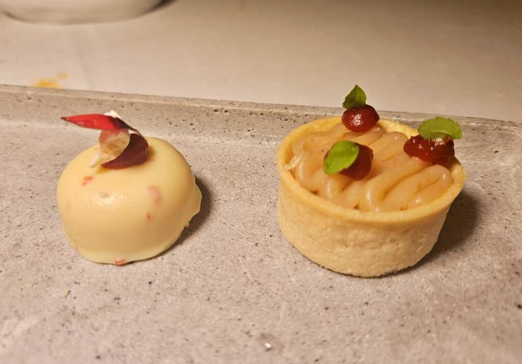 Die Küche grüßte abschließend mit einem Mürbteig-Tartelette, gefüllt mit einer Holunderblüten-Crème und mit einer sehr feinen Praline aus weißer Ganache mit Erdbeere.