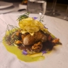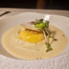 Mizuna Oxalys-Knolle, gepufftes Quinoa, geröstete Kürbiskerne, Salat und Kapuzinerkresse. Frisch und knackig, aber gleichzeitig Röstnoten gaben einen Wink, wohin sich die Küche entwickelt. Asiaitische Einflüsse sind deutlich, und es wird zunehmend auf überzeugende vegetarische Alternativen geachtet.