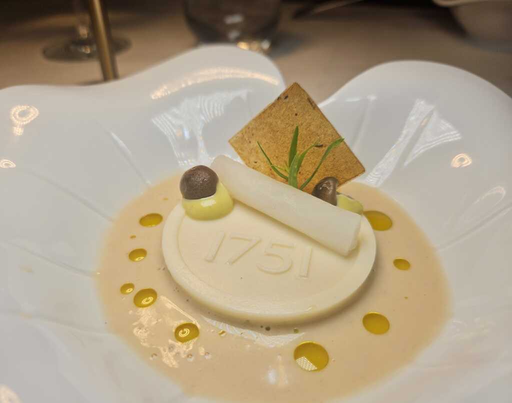 Als Fleischgang gab es Rücken von ostfriesischem Osterlamm, vorbildlich angebraten und sousvide rosa gegart, ohne dass die Faserstruktur verloren gegangen wäre. Halt ein leckeres Stück Lammfleisch und großzügig portioniert. Tatsächlich sind es ja die Beilagen, die beim Hauptgang den Unterschied machen. Hier „feuerte“ die Küche wieder aus allen Rohren: Grüner Spargel, lila Magnolie, Romanasalat, Ziegenkäse, Johannisbeere wurden in verschiedenen Verarbeitungen präsentiert, teilweise in gesondertem Geschirr. Das war alles handwerklich top und ermöglichte natürlich eine Vielzahl von Kombinationen und wechselndes Mundgefühl. Schön z.B. die Tartelette mit Käse und Johannisbeere, deren Säure vom Umami der Jus abgelöst wurde bis sich die grüne Note des Spargels bemerkbar machte. Auch der Chip mit Spargelstaub überzeugte. Sehr gut der Salat, der recht puristisch auf Frische und die Ätherik der eingelegten Magnolienblüte setzte, um der Schwere des Fleischgerichts mehr als die übliche Fruchtsäure entgegen zu setzen.