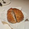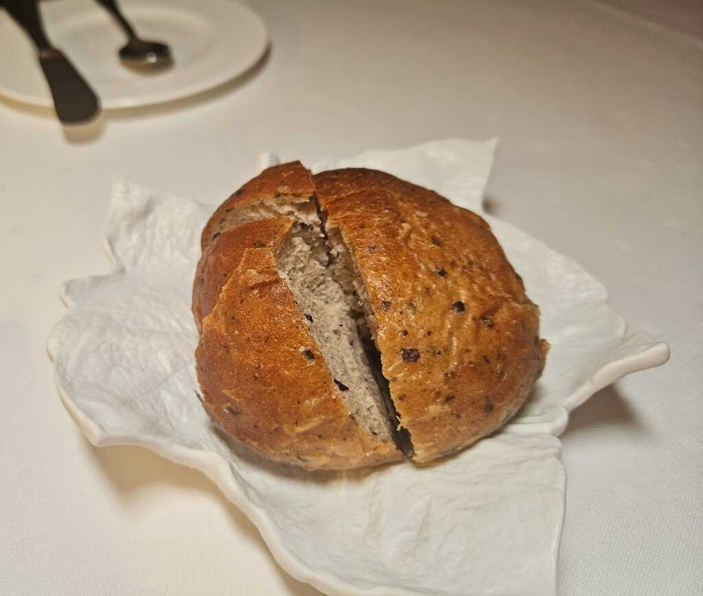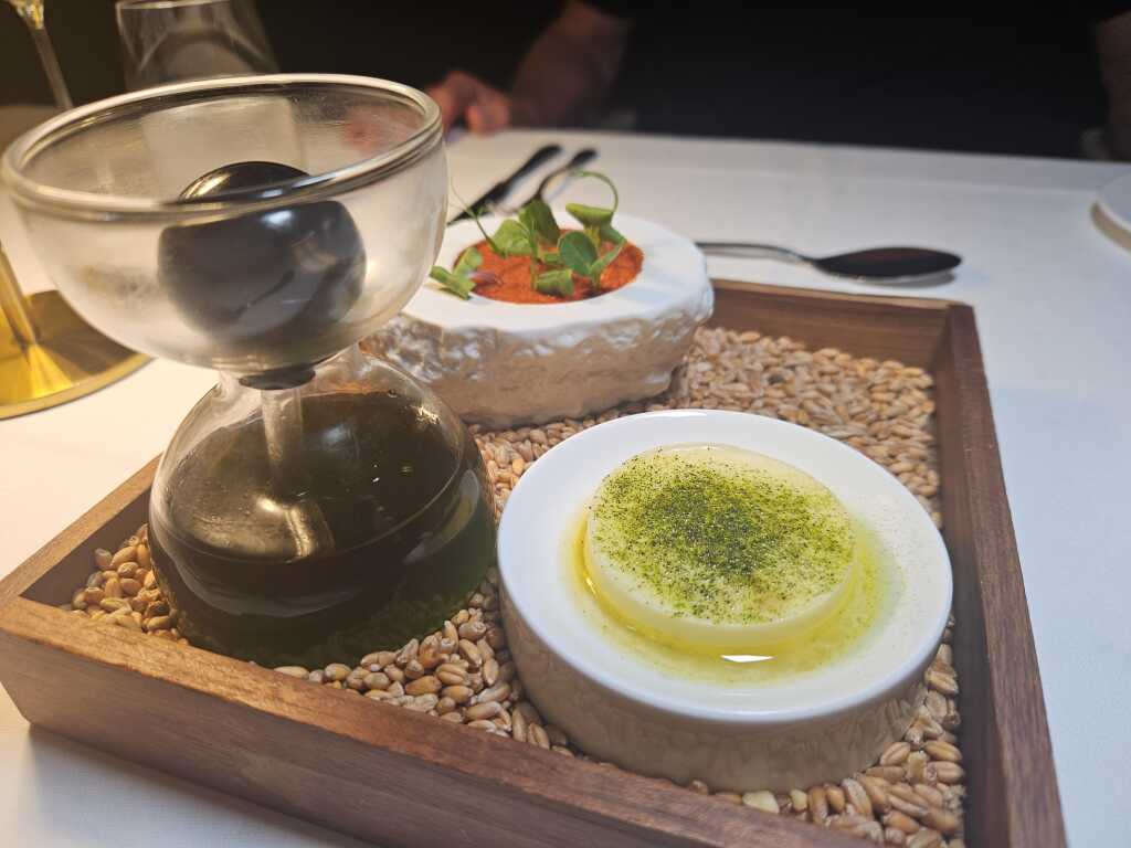 Das „Signature“-Brot wird - wie es sich für die weinzigartige Geschichte des Hauses gehört - mit Rotwein-Trester angereichert, den man mit sieht, riecht und schmeckt. Etwas speziell; ich finde es genial. Erst recht mit den Begleitungen: Intensiver Paprika-Frischkäse, mit Thymian bestäubte Zitronen-Joghurt-Butter . Das mit Lauchasche aromatisierte, zwischen Grün und schwarz changierende Öl darf sich der Gast per Pipette selbst dosieren. Erfreulich die für zwei Personen übersichtliche Größe des Laibs; sonst bin ich schon nach so leckerem Brot halb satt…